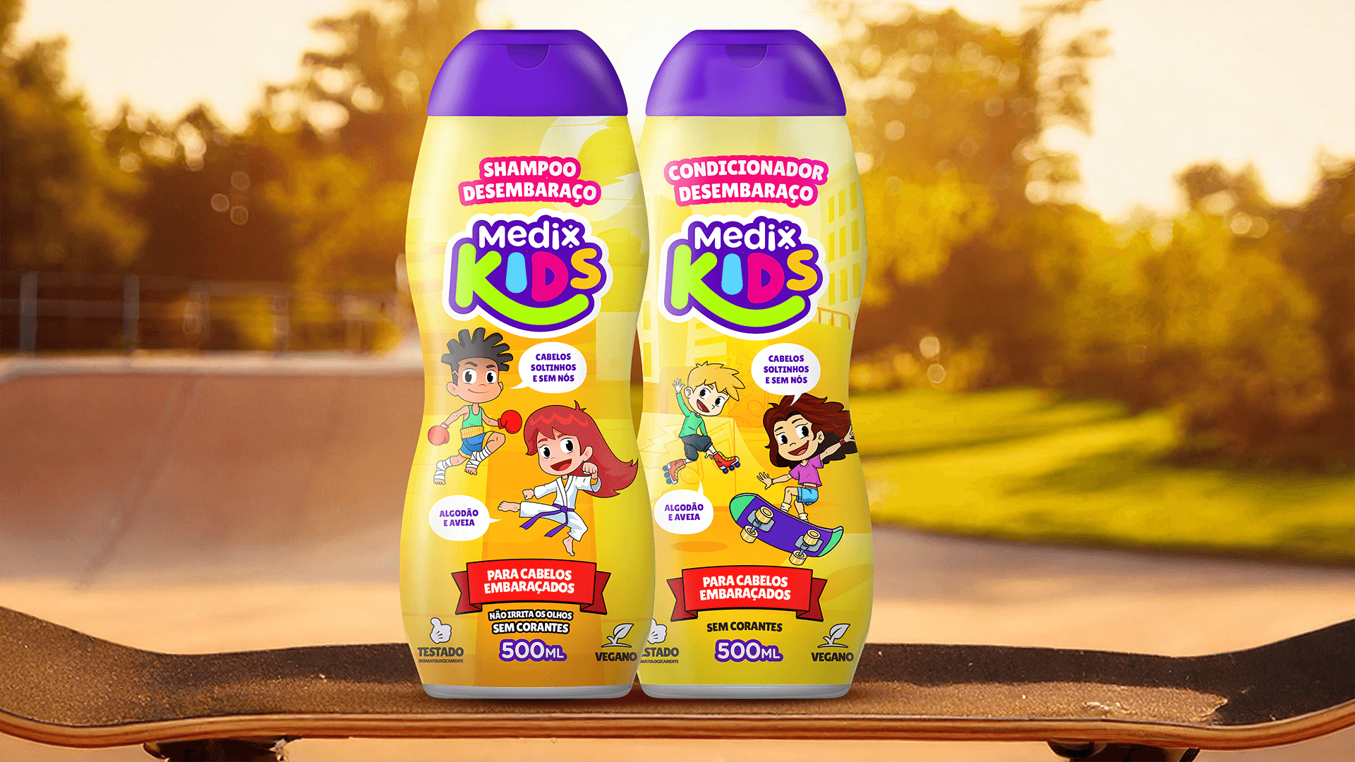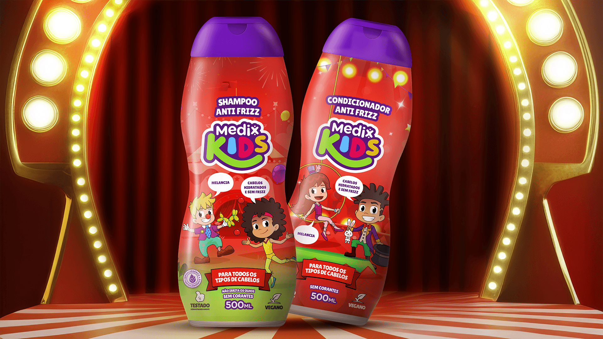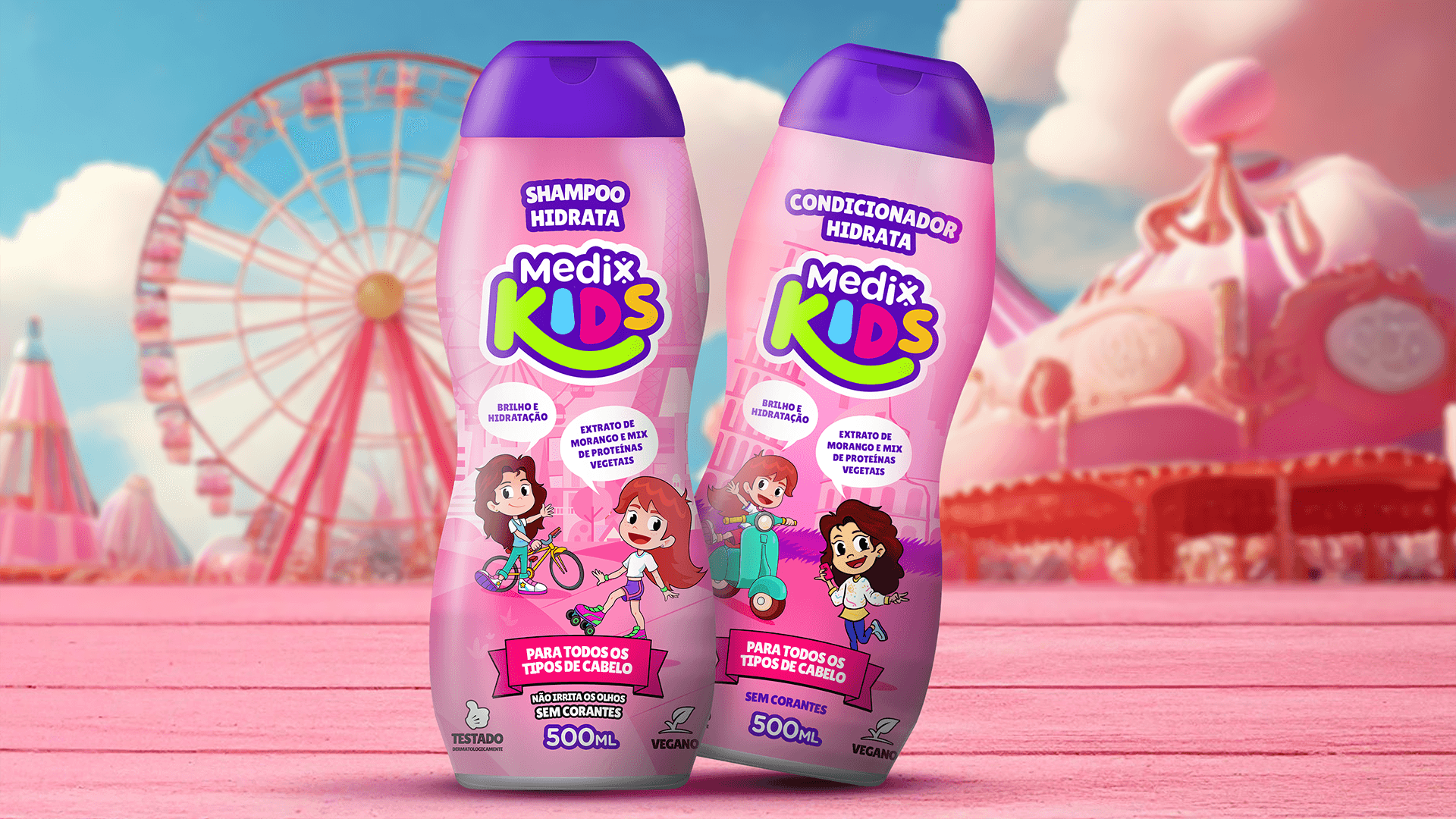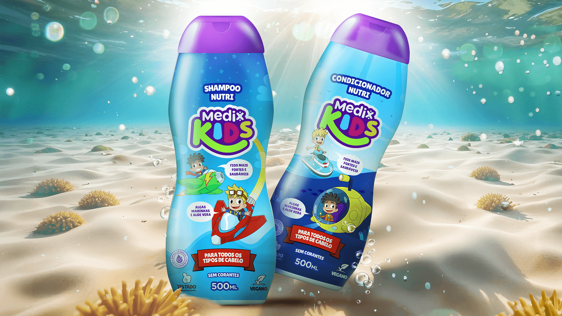 Audria Cosméticos, a partner for over 7 years, launched Medix Kids - extending their vegan, modern, and tech-forward line to children. The challenge went beyond adapting labels: it required creating a complete identity that translated the adult line's premium values into a language that speaks to kids, without losing the brand's sophistication and credibility. The products needed to capture children's imagination, communicate efficacy to parents, and stand out in a highly competitive market.